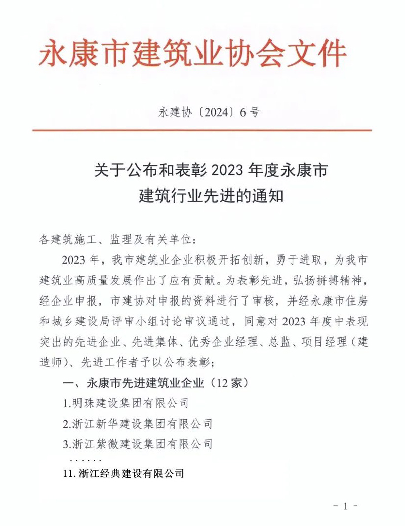 近日,永康市建筑業(yè)協(xié)會隆重發(fā)文,對2023年度全市建筑業(yè)的先進企業(yè)和個人進行了表彰。在此次表彰中,浙江經(jīng)典建設(shè)有限公司憑借其卓越的表現(xiàn)和突出的貢獻,斬獲了多項年度榮譽。